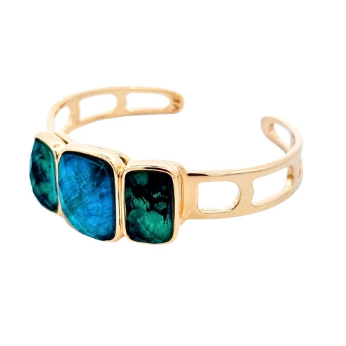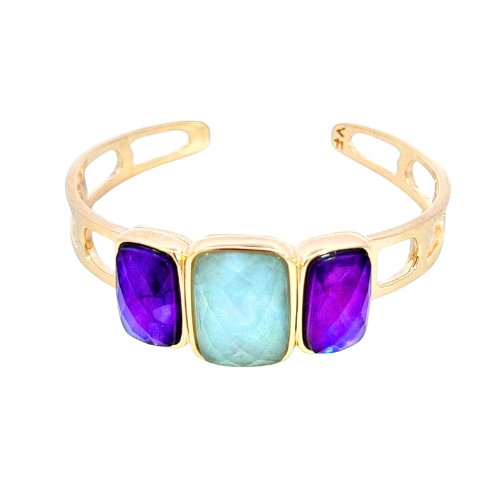 Pulsera Antiguo Rectangular con tres piedras, con aro de aleación noble de metales bañado en oro de 18k, con doublet/triplet compuesto íntegramente por piedras naturales, siendo Cristal de Roca en la parte superior (corona) y diversas piedras naturales en la parte inferior. No contiene piedras sintéticas ni reconstituidas en su composición, salvo que se especifique. Tallado disponible: Briolette